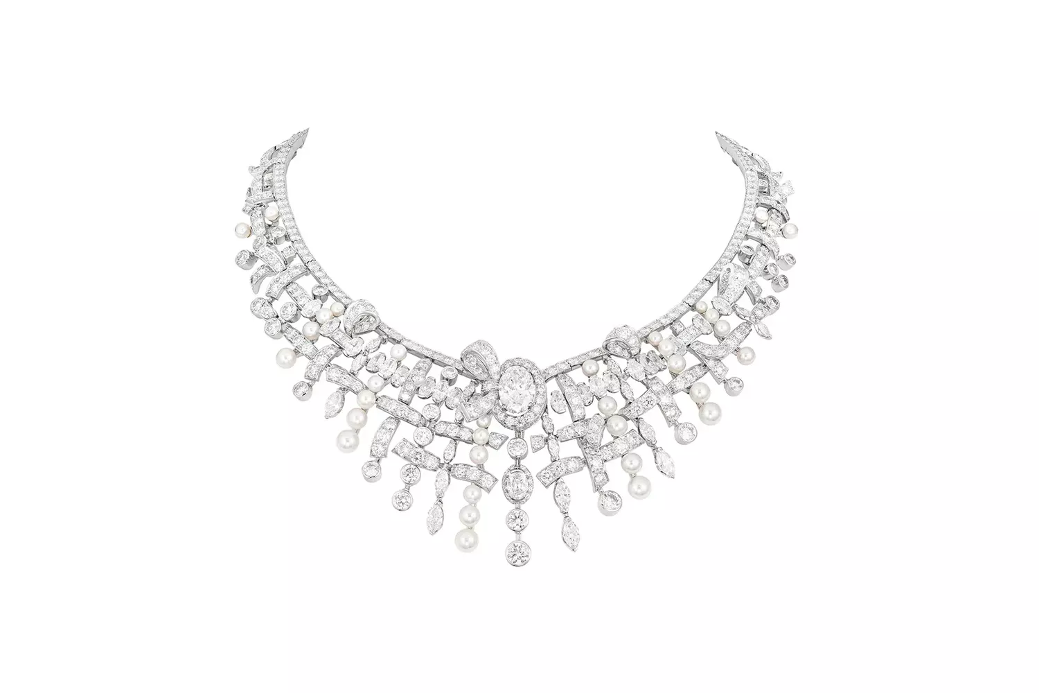 The Tweed Pastel necklace in white gold, cultured pearls and diamonds.