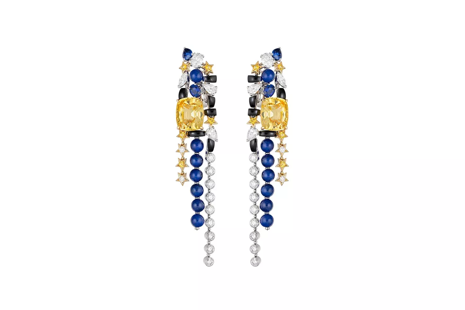The collection’s Star chapter explores blue in all its forms, from lapis to sapphires to onyx. These earrings celebrate the rich texture and free-flowing movement of Chanel tweed. .